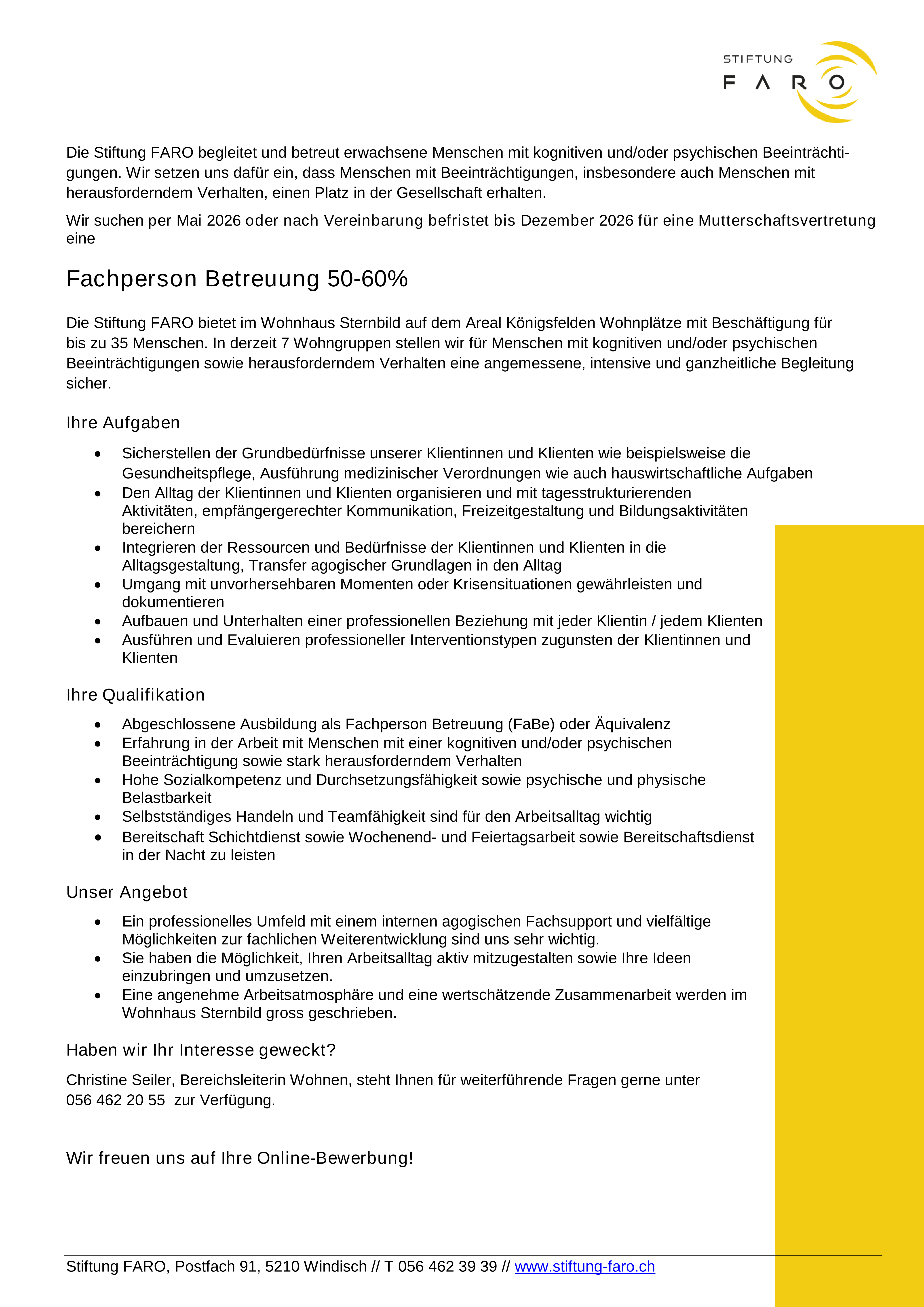 Fachperson Betreuung befristet für Mutterschaftsvertretung 50-60%