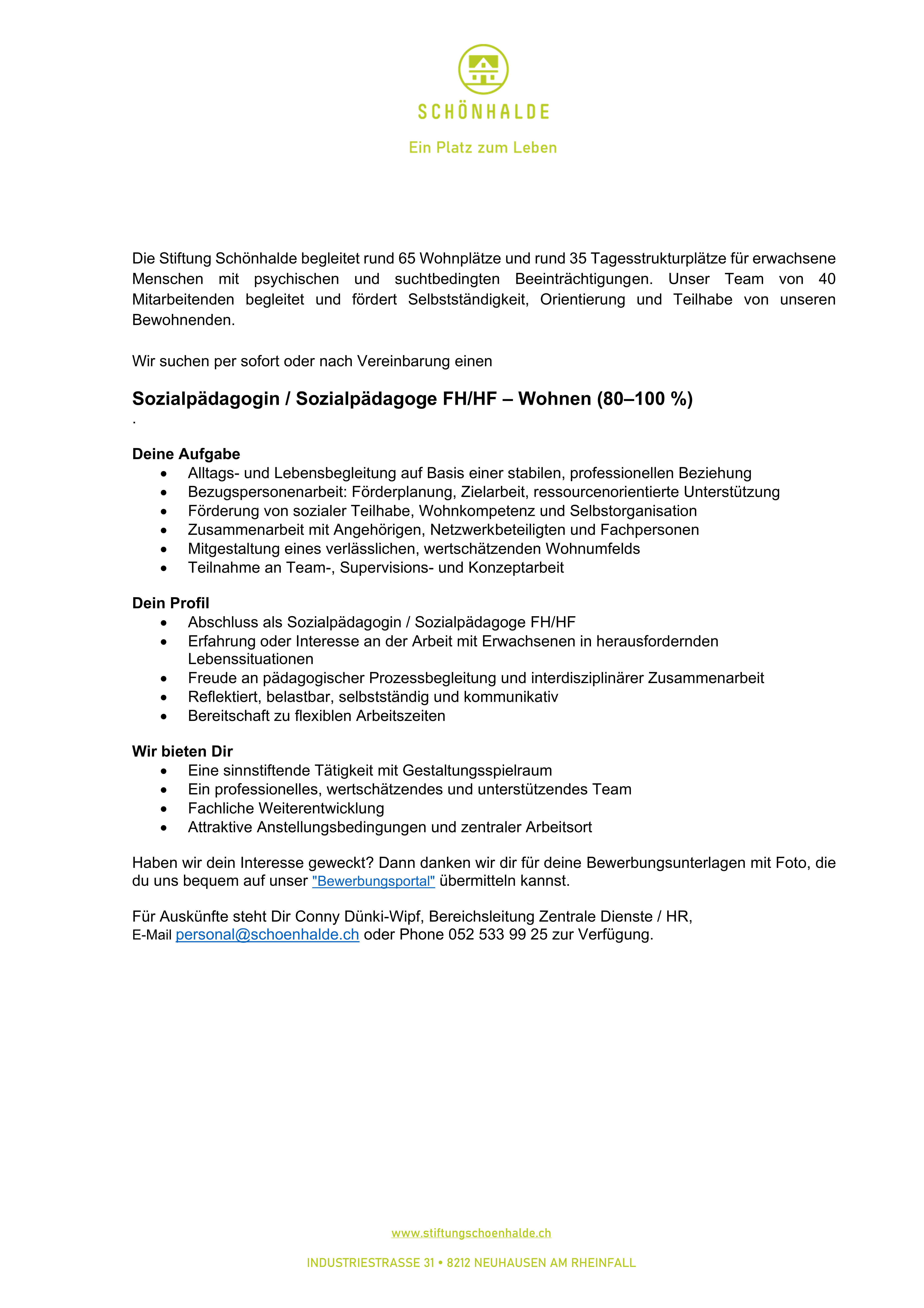 Sozialpädagogin / Sozialpädagoge FH/HF – Wohnen (80–100 %) 80-100%