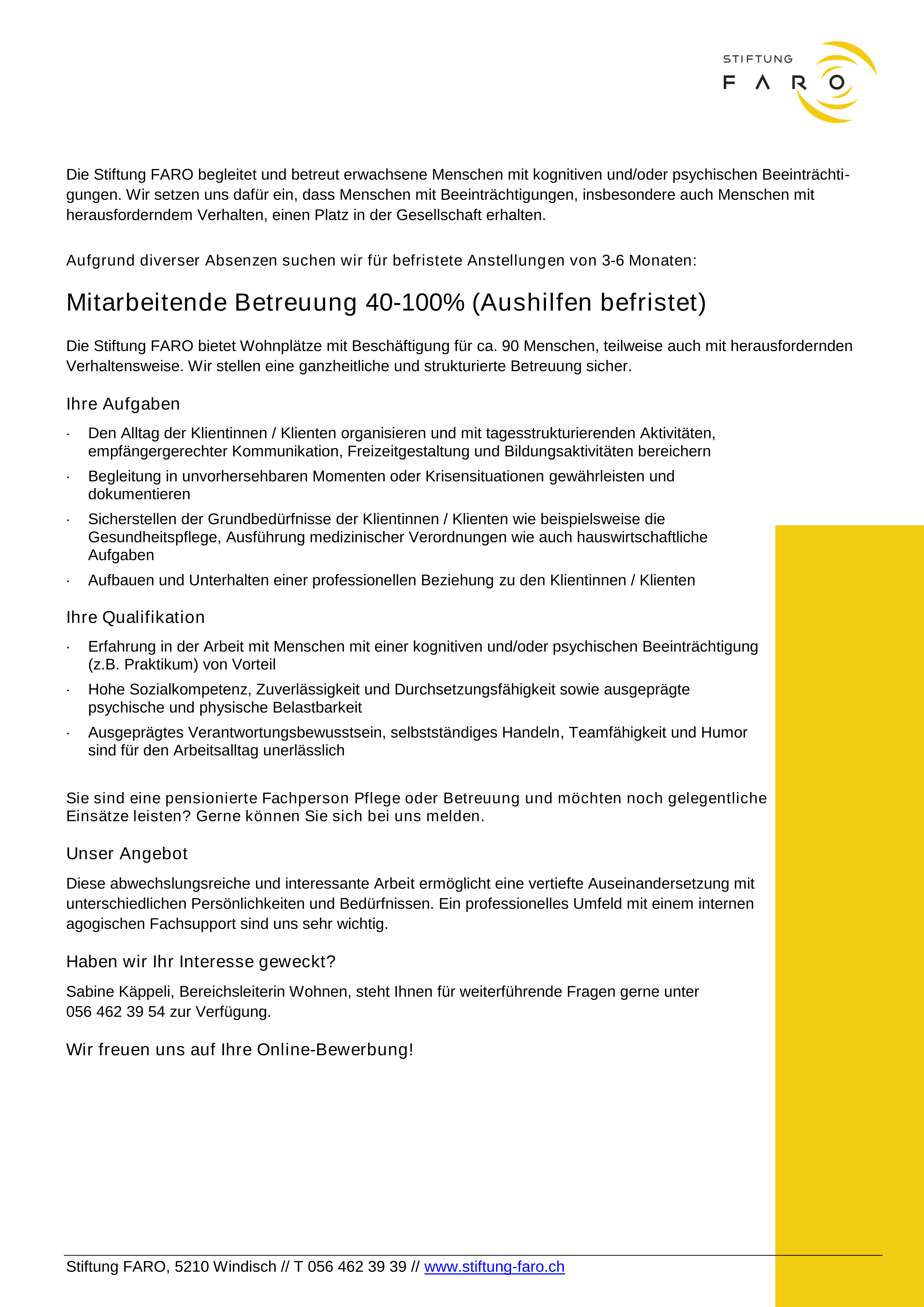 Mitarbeitende Betreuung (befristete Aushilfe) 40-100%