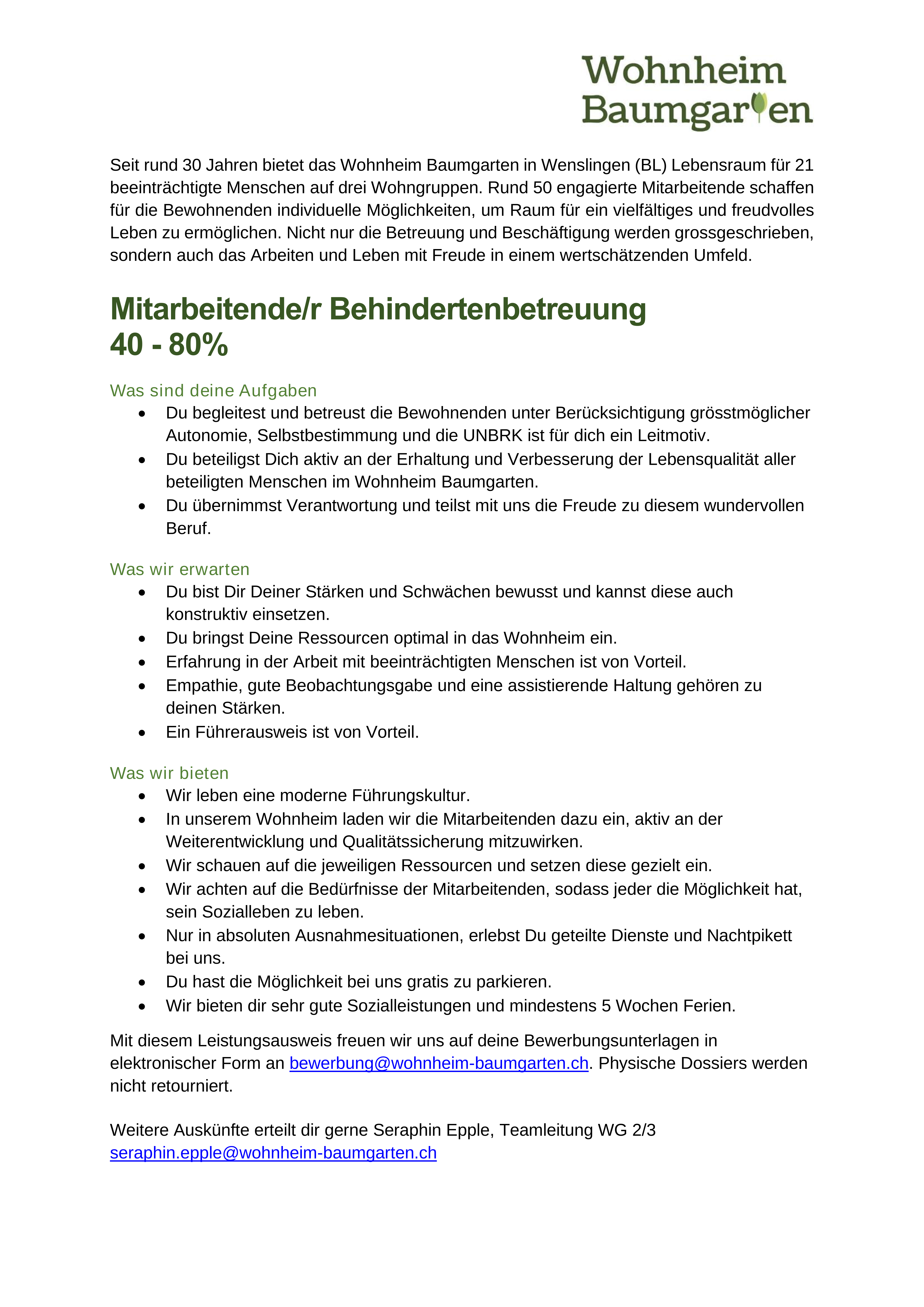 Mitarbeitende/r Behindertenbetreuung 40-80%